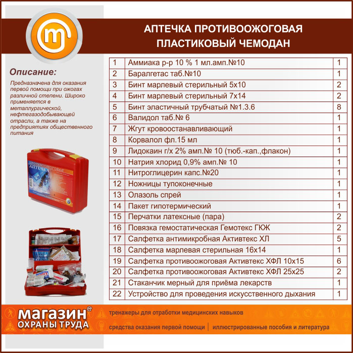 Противоожоговые аптечки в виде сумки либо пластикового чемодана предназначены для оказания первой помощи при ожогах различной степени. Широко применяется в металлургической, нефтегазодобывающей отрасли, а также на предприятиях общественного питания