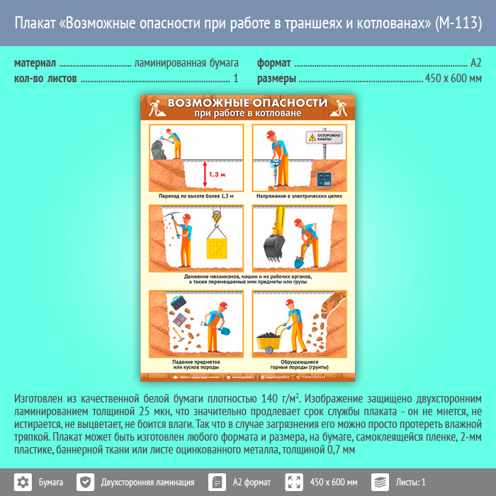 Плакат «Возможные опасности при работе в траншеях и котлованах» (М-113, ламинированная бумага, А2, 1 лист) в Ульяновске купить