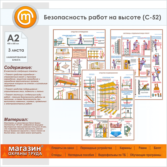 Плакаты «Безопасность работ на высоте» (С-52, ламинированная бумага, А2, 3 листа) в Ульяновске купить