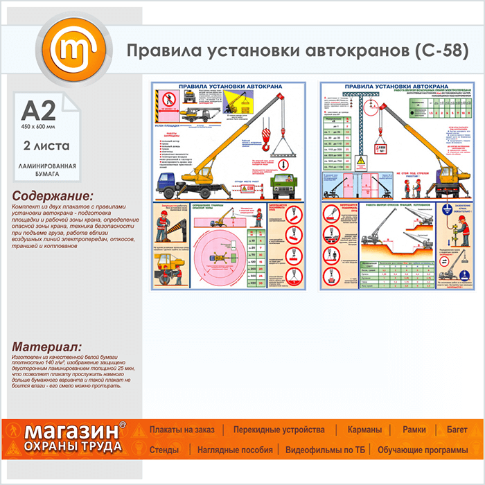 Плакаты «Правила установки автокранов» (С-58, ламинированная бумага, А2, 2 листа) в Ульяновске купить