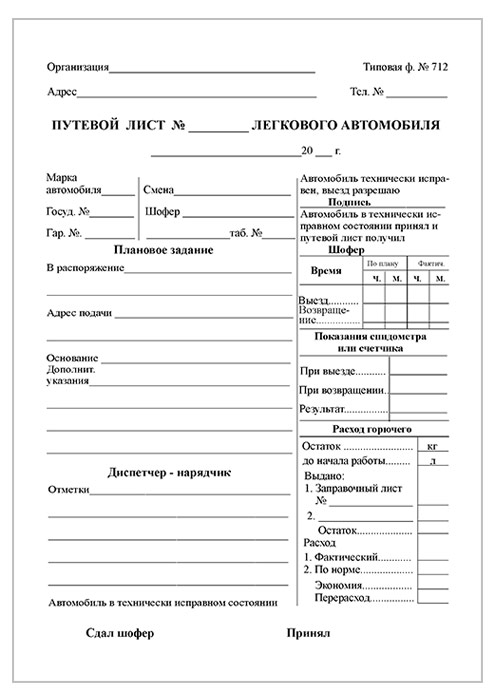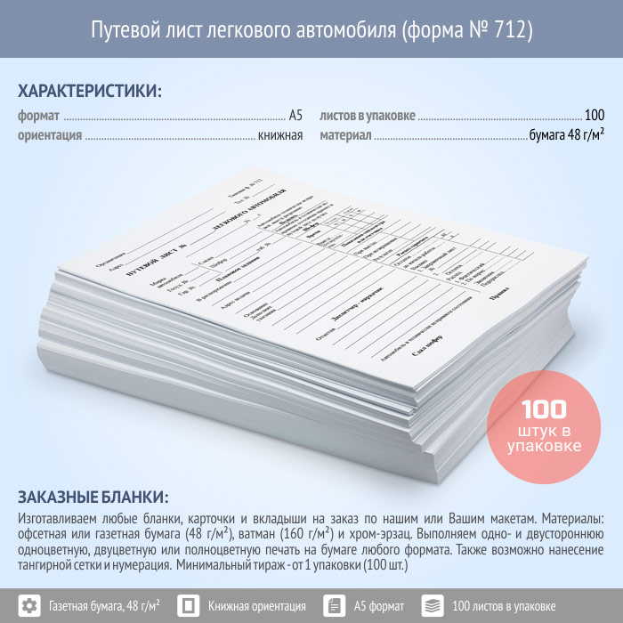 Путевой лист легкового автомобиля (форма № 712, упаковка из 100 штук) в Ульяновске купить