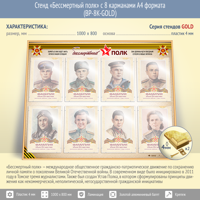 Стенд «Бессмертный полк» с 8 карманами А4 формата (BP-8K-GOLD) в Ульяновске купить