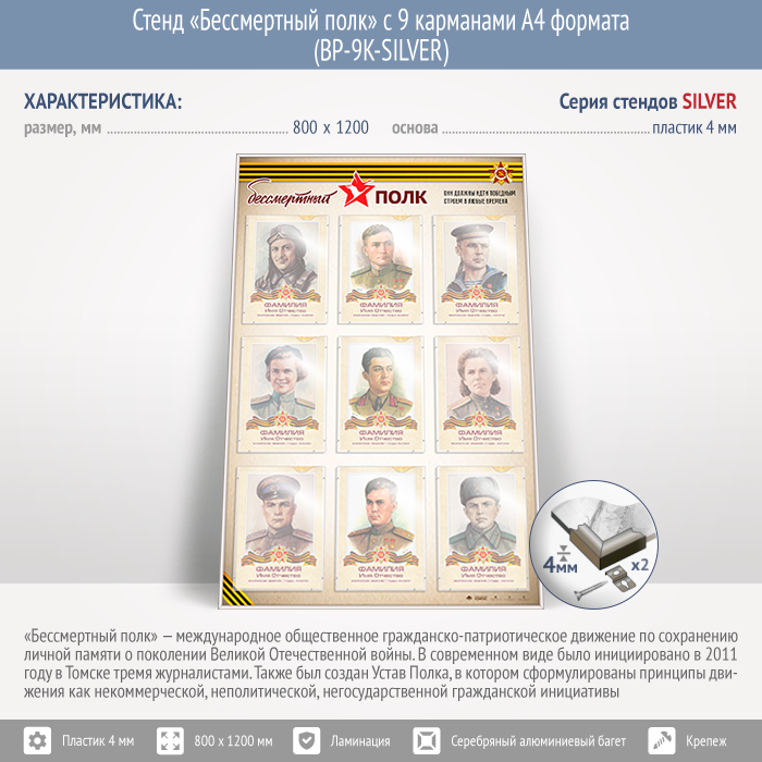 Стенд «Бессмертный полк» с 9 карманами А4 формата (BP-9K-SILVER) в Ульяновске купить