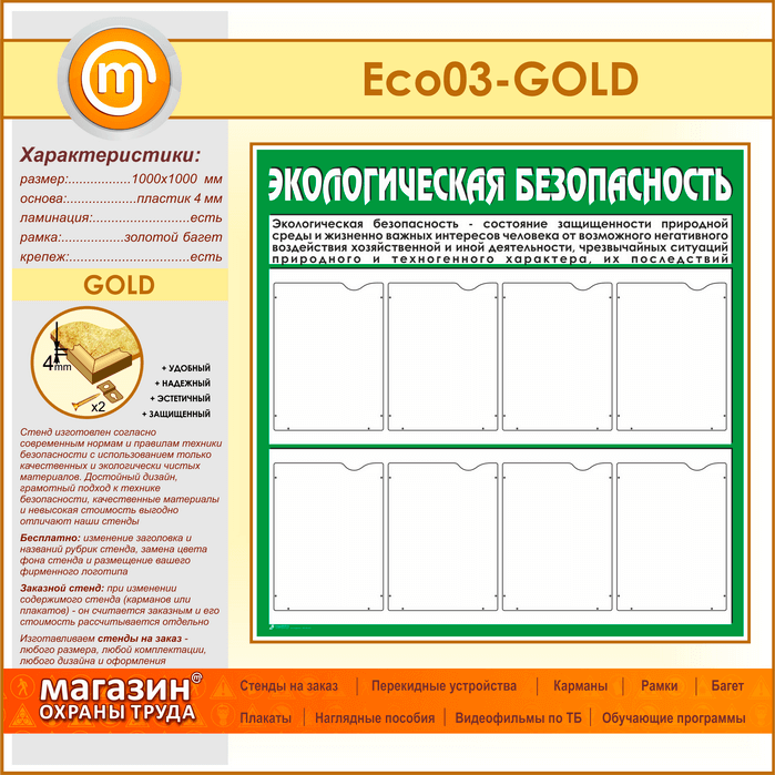 Стенд «Экологическая безопасность» с 8 карманами (ECO-03-GOLD) в Ульяновске купить