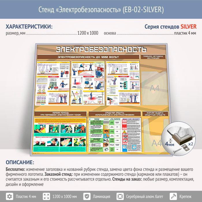 Стенд «Электробезопасность до 1000 вольт» с плоским и объемным карманами (EB-02-SILVER) в Ульяновске купить