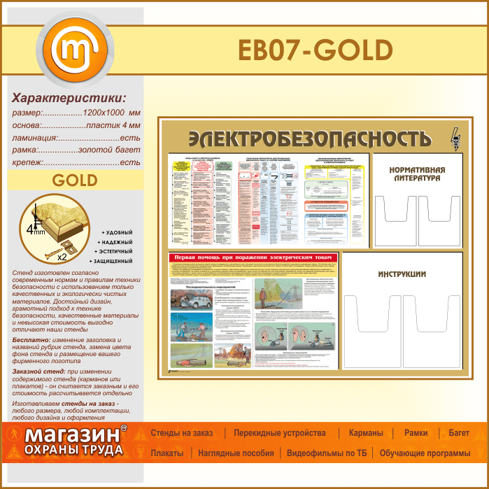 Стенд «Электробезопасность» с 4 объемными карманами (EB-07-GOLD) в Ульяновске купить