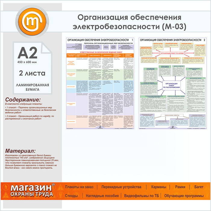 Плакаты «Организация обеспечения электробезопасности» (М-03, ламинированная бумага, А2, 2 листа) в Ульяновске купить