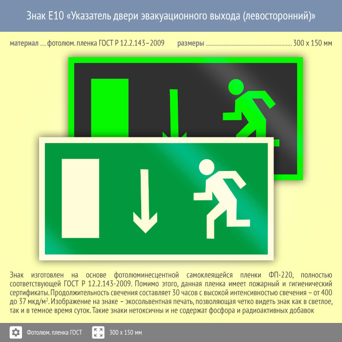 Знак E10 «Указатель двери эвакуационного выхода (левосторонний)» (фотолюминесцентная пленка ГОСТ 34428-2018, 300х150 мм) в Ульяновске купить