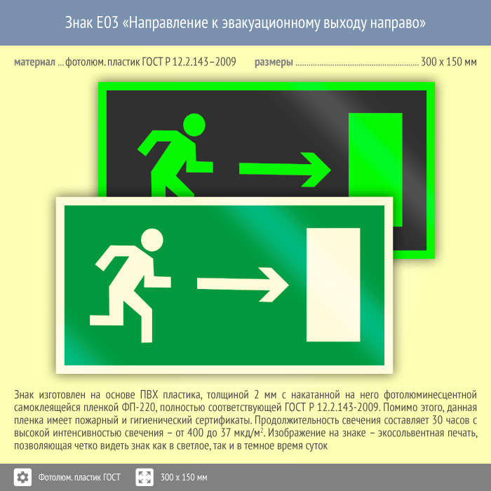 Знак E03 «Направление к эвакуационному выходу направо» (фотолюминесцентный пластик ГОСТ 34428-2018, 300х150 мм) в Ульяновске купить