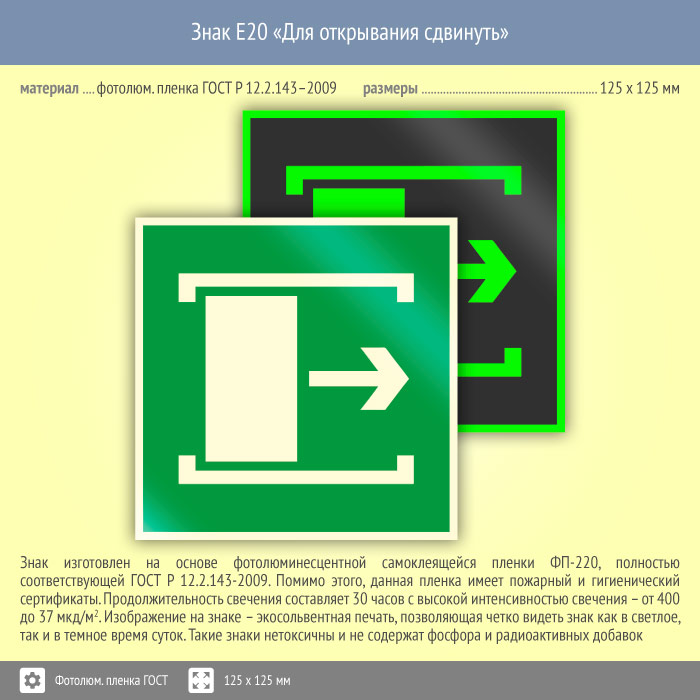 Знак E20 «Для открывания сдвинуть» (фотолюминесцентный пластик ГОСТ 34428-2018, 125х125 мм) в Ульяновске купить