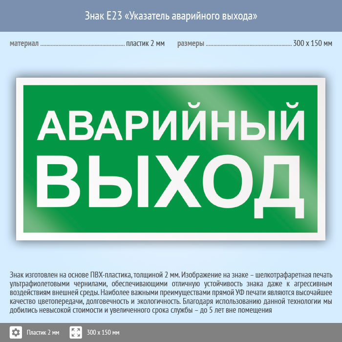 Знак E23 «Указатель аварийного выхода» (пластик, 300х150 мм) в Ульяновске купить