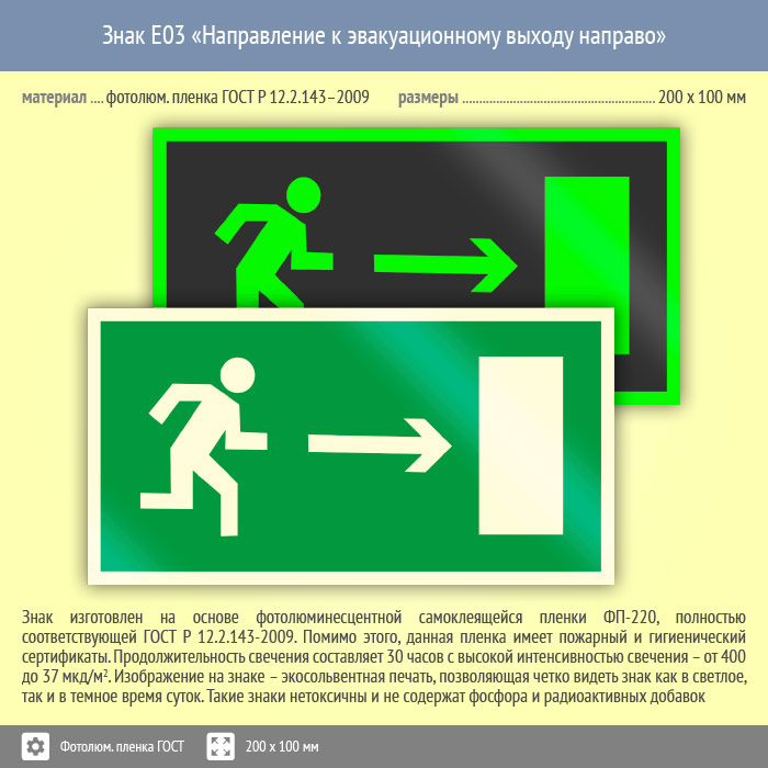 Знак E03 «Направление к эвакуационному выходу направо» (фотолюминесцентная пленка ГОСТ 34428-2018, 200х100 мм) в Ульяновске купить