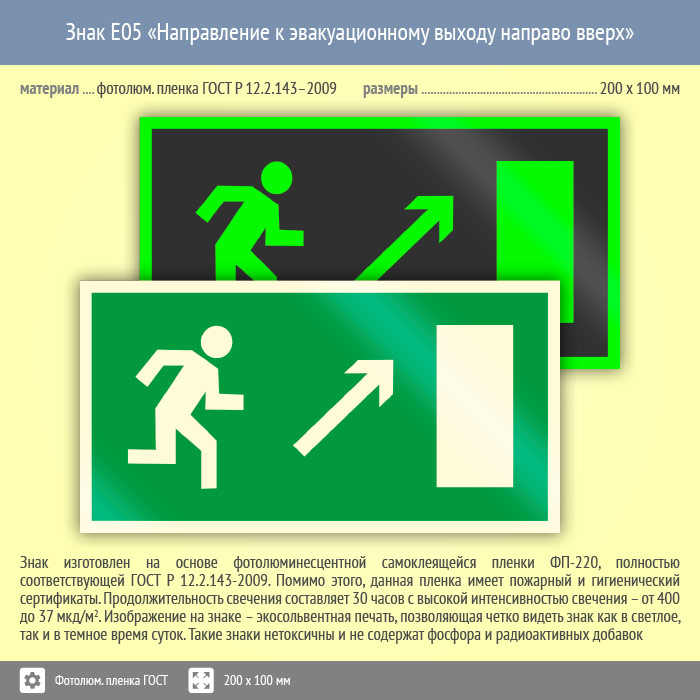 Знак E05 «Направление к эвакуационному выходу направо вверх» (фотолюминесцентная пленка ГОСТ 34428-2018, 200х100 мм) в Ульяновске купить