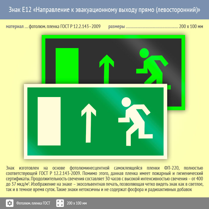 Знак E12 «Направление к эвакуационному выходу прямо (левосторонний)» (фотолюминесцентная пленка ГОСТ 34428-2018, 200х100 мм) в Ульяновске купить