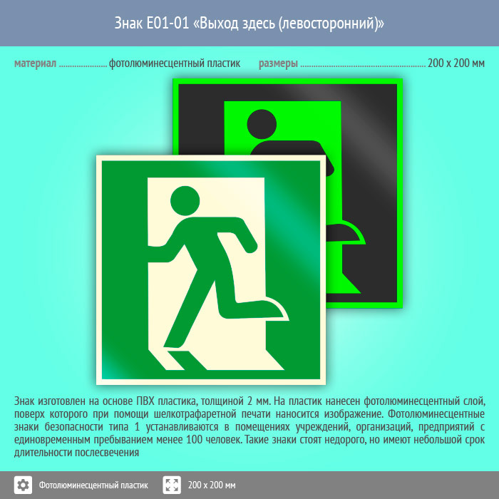 Знак E01-01 «Выход здесь (левосторонний)» (фотолюминесцентный пластик, 200х200 мм) в Ульяновске купить