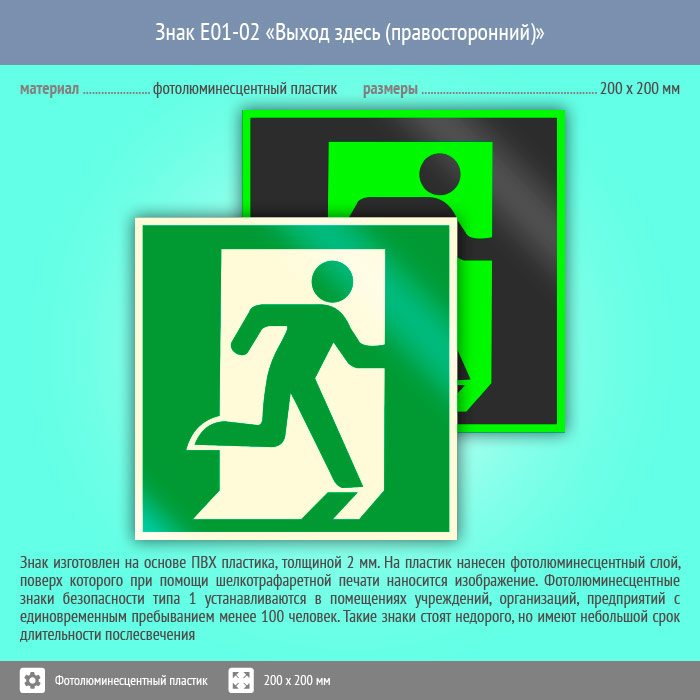 Знак E01-02 «Выход здесь (правосторонний)» (фотолюминесцентный пластик, 200х200 мм) в Ульяновске купить