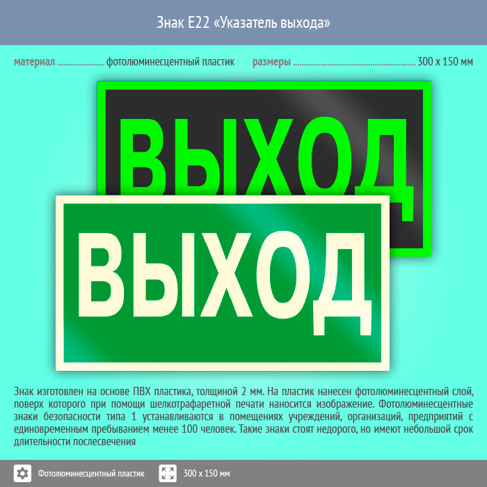 Знак E22 «Указатель выхода» (фотолюминесцентный пластик, 300х150 мм) в Ульяновске купить