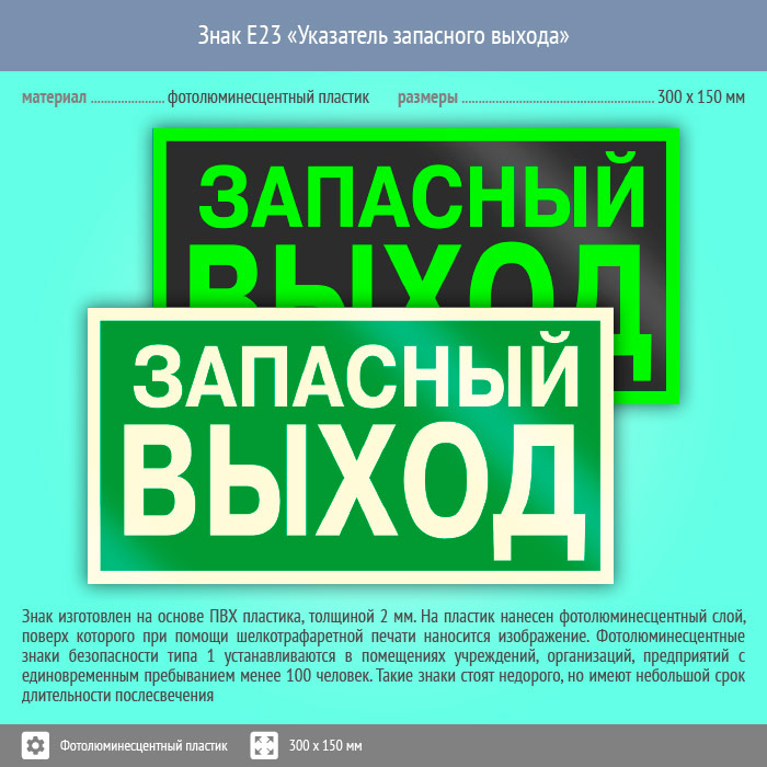 Знак E23 «Указатель запасного выхода» (устаревший) (фотолюминесцентный пластик, 300х150 мм) в Ульяновске купить