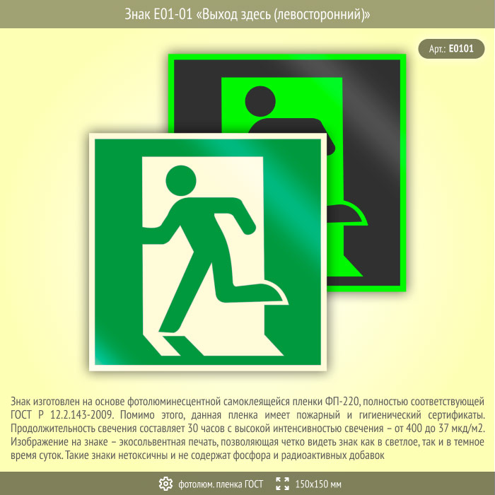 Знак E01-01 «Выход здесь (левосторонний)» (фотолюминесцентная пленка ГОСТ 34428-2018, 150х150 мм) в Ульяновске купить