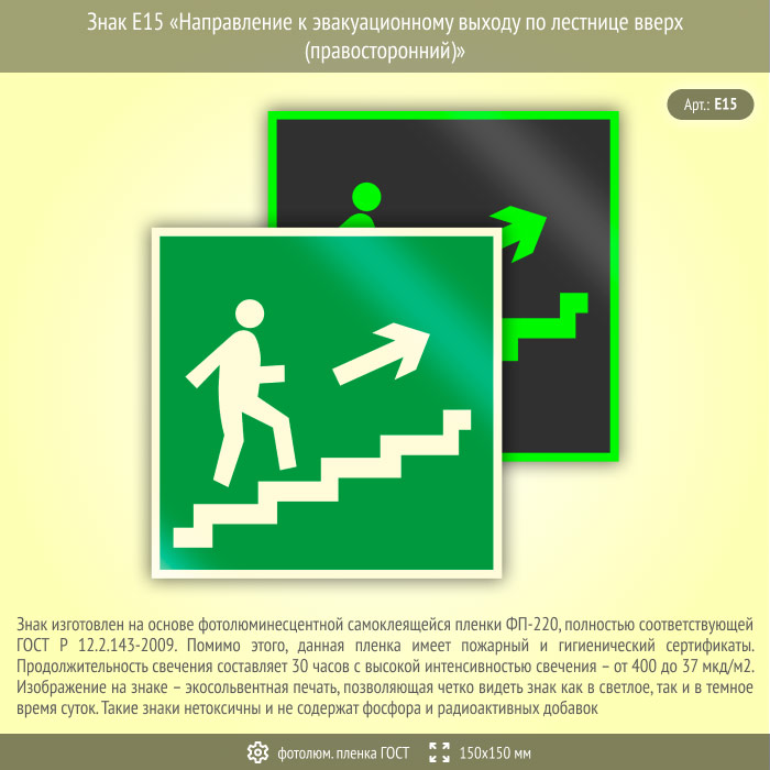 Знак E15 «Направление к эвакуационному выходу по лестнице вверх (правосторонний)» (фотолюминесцентная пленка ГОСТ 34428-2018, 150х150 мм) в Ульяновске купить