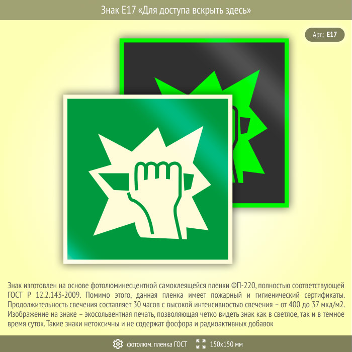 Знак E17 «Для доступа вскрыть здесь» (фотолюминесцентная пленка ГОСТ 34428-2018, 150х150 мм) в Ульяновске купить
