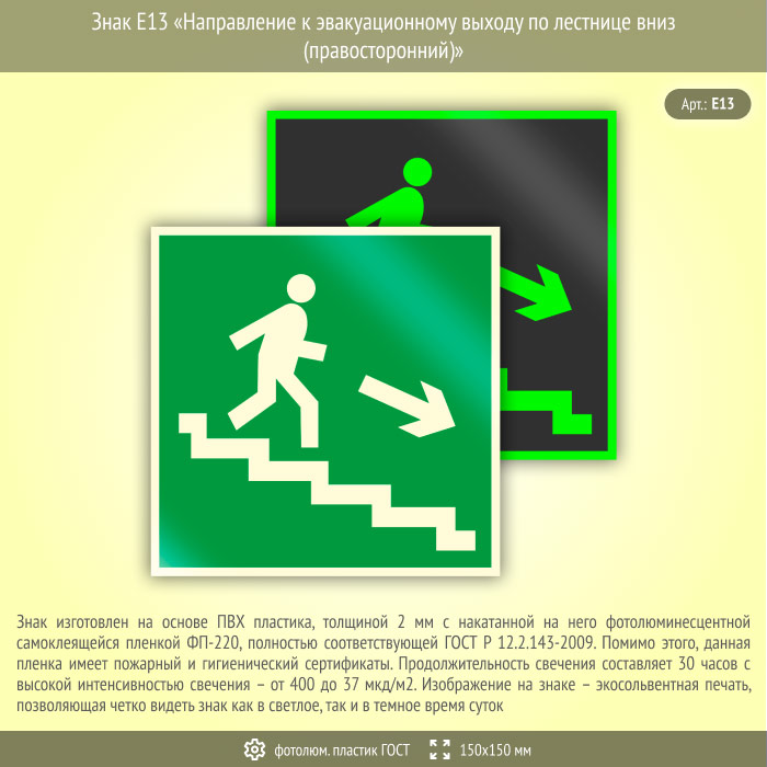 Знак E13 «Направление к эвакуационному выходу по лестнице вниз (правосторонний)» (фотолюминесцентный пластик ГОСТ 34428-2018, 150х150 мм) в Ульяновске купить