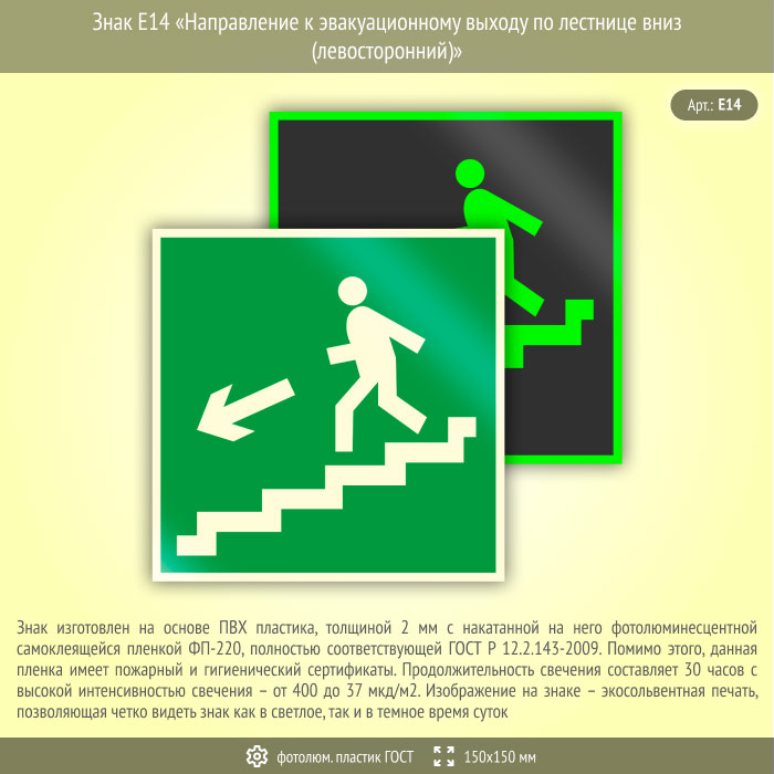 Знак E14 «Направление к эвакуационному выходу по лестнице вниз (левосторонний)» (фотолюминесцентный пластик ГОСТ 34428-2018, 150х150 мм) в Ульяновске купить