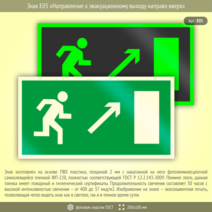 Знак E05 «Направление к эвакуационному выходу направо вверх» (фотолюминесцентный пластик ГОСТ 34428-2018, 200х100 мм) в Ульяновске купить