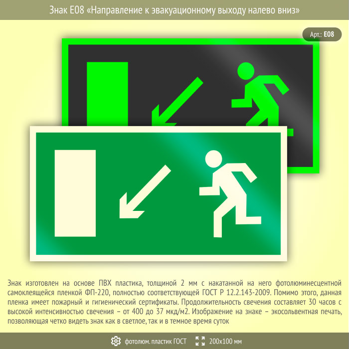 Знак E08 «Направление к эвакуационному выходу налево вниз» (фотолюминесцентный пластик ГОСТ 34428-2018, 200х100 мм) в Ульяновске купить