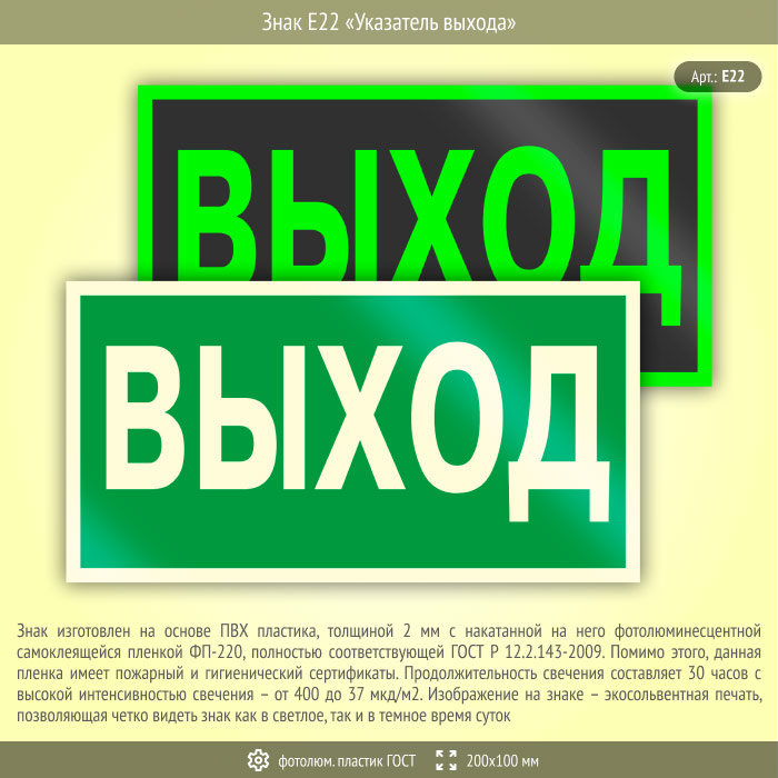 Знак E22 «Указатель выхода» (фотолюминесцентный пластик ГОСТ 34428-2018, 200х100 мм) в Ульяновске купить