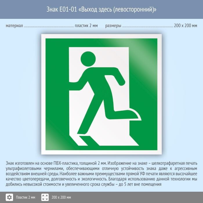 Знак E01-01 «Выход здесь (левосторонний)» (пластик, 200х200 мм) в Ульяновске купить
