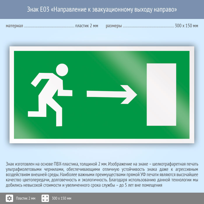 Знак E03 «Направление к эвакуационному выходу направо» (пластик, 300х150 мм) в Ульяновске купить