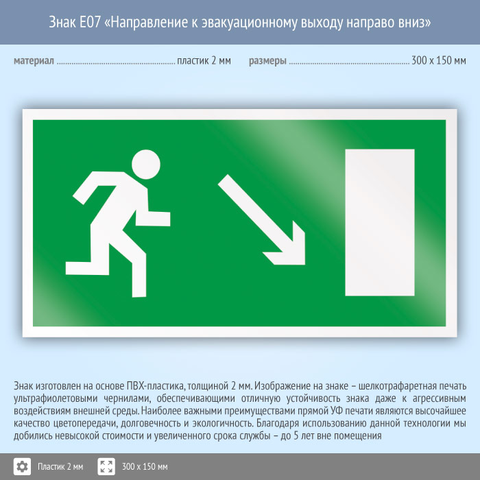 Знак E07 «Направление к эвакуационному выходу направо вниз» (пластик, 300х150 мм) в Ульяновске купить