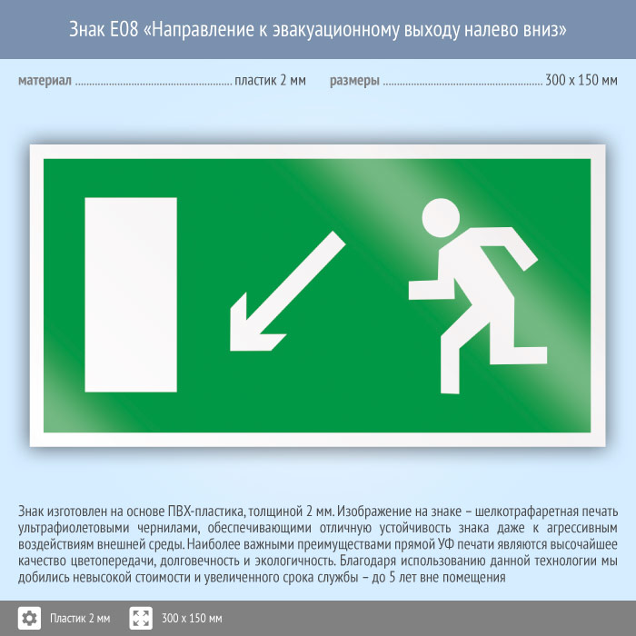 Знак E08 «Направление к эвакуационному выходу налево вниз» (пластик, 300х150 мм) в Ульяновске купить