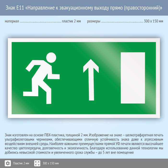 Знак E11 «Направление к эвакуационному выходу прямо (правосторонний)» (пластик, 300х150 мм) в Ульяновске купить