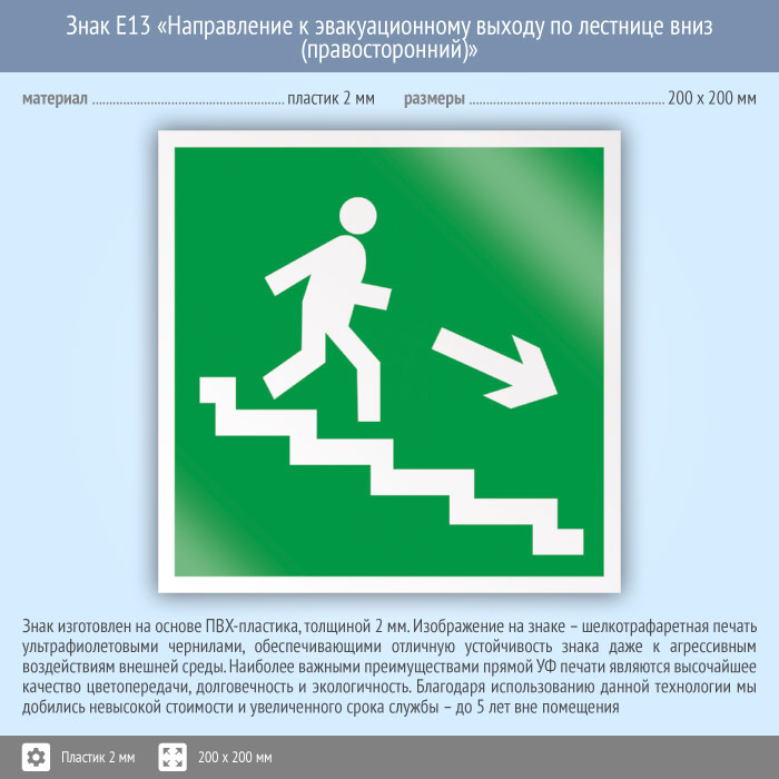Знак E13 «Направление к эвакуационному выходу по лестнице вниз (правосторонний)» (пластик, 200х200 мм) в Ульяновске купить