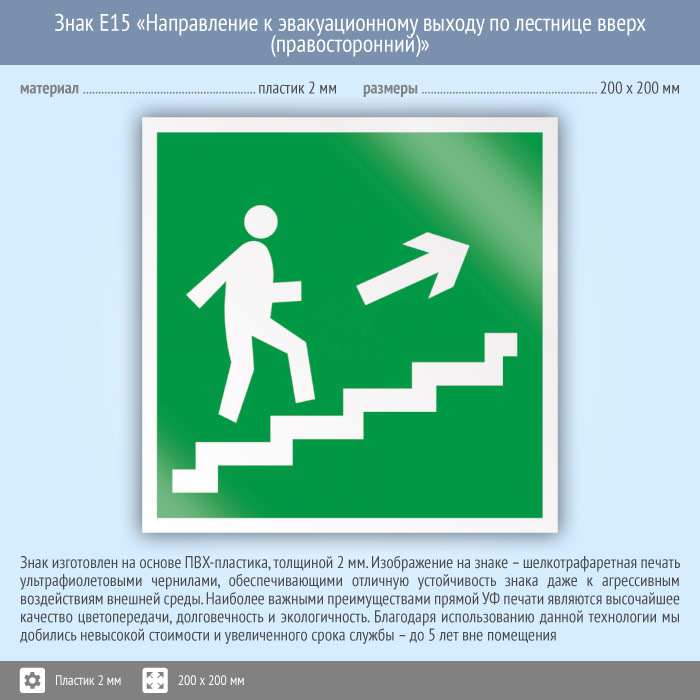 Знак E15 «Направление к эвакуационному выходу по лестнице вверх (правосторонний)» (пластик, 200х200 мм) в Ульяновске купить