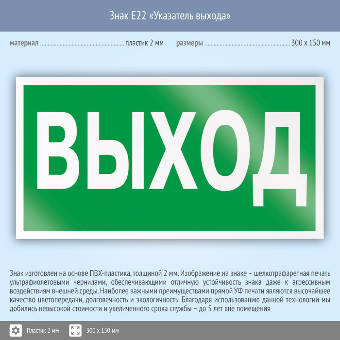 Знак E22 «Указатель выхода» (пластик, 300х150 мм) в Ульяновске купить
