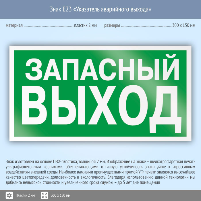 Знак E23 «Указатель запасного выхода» (устаревший) (пластик, 300х150 мм) в Ульяновске купить
