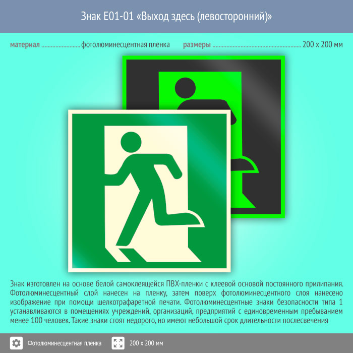 Знак E01-01 «Выход здесь (левосторонний)» (фотолюминесцентная пленка, 200х200 мм) в Ульяновске купить