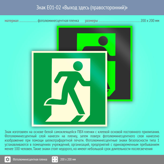 Знак E01-02 «Выход здесь (правосторонний)» (фотолюминесцентная пленка, 200х200 мм) в Ульяновске купить