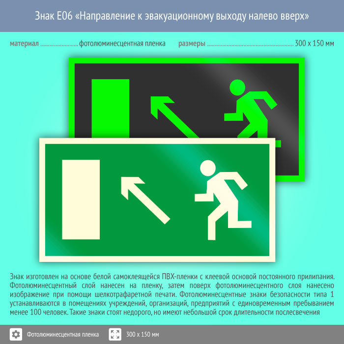Знак E06 «Направление к эвакуационному выходу налево вверх» (фотолюминесцентная пленка, 300х150 мм) в Ульяновске купить