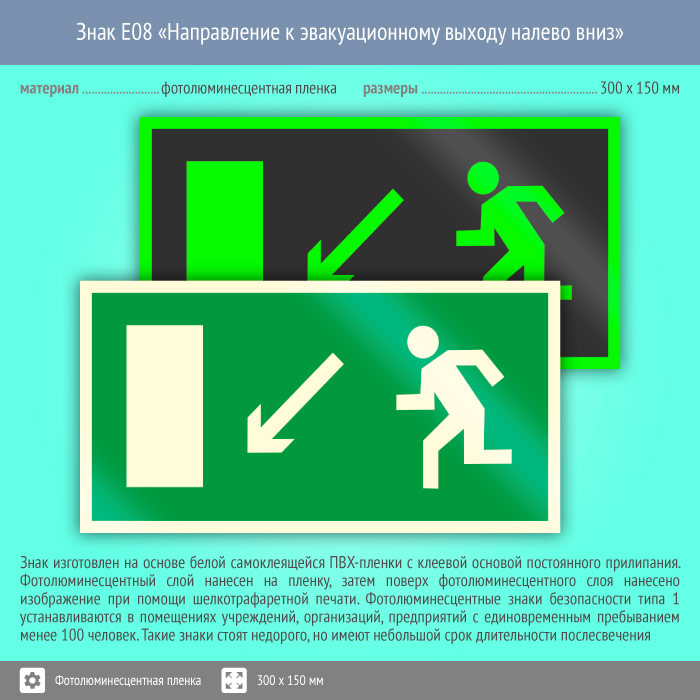 Знак E08 «Направление к эвакуационному выходу налево вниз» (фотолюминесцентная пленка, 300х150 мм) в Ульяновске купить