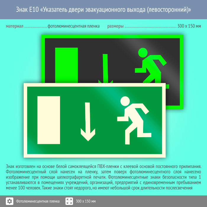 Знак E10 «Указатель двери эвакуационного выхода (левосторонний)» (фотолюминесцентная пленка, 300х150 мм) в Ульяновске купить