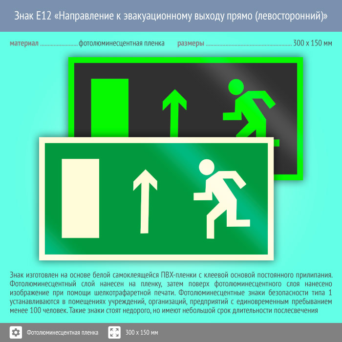 Знак E12 «Направление к эвакуационному выходу прямо (левосторонний)» (фотолюминесцентная пленка, 300х150 мм) в Ульяновске купить