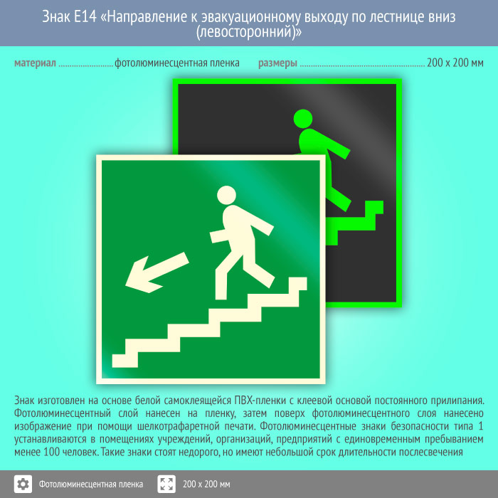 Знак E14 «Направление к эвакуационному выходу по лестнице вниз (левосторонний)» (фотолюминесцентная пленка, 200х200 мм) в Ульяновске купить