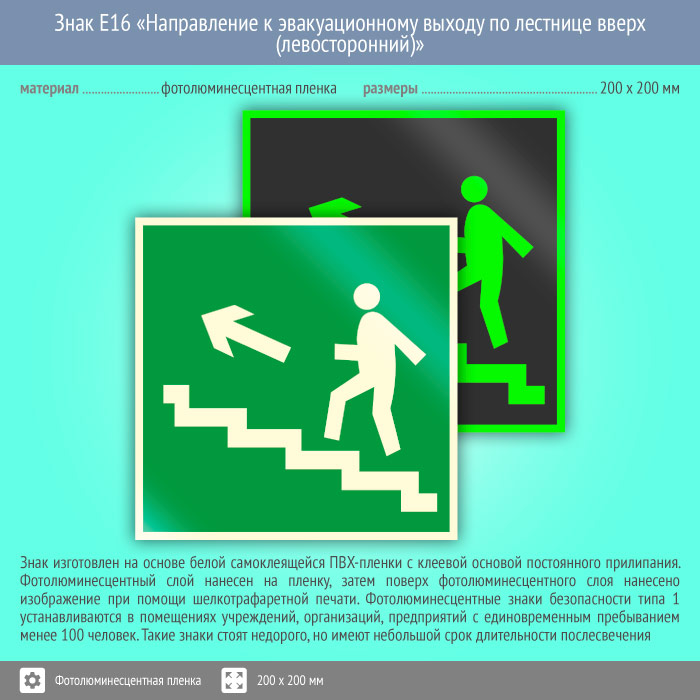Знак E16 «Направление к эвакуационному выходу по лестнице вверх (левосторонний)» (фотолюминесцентная пленка, 200х200 мм) в Ульяновске купить