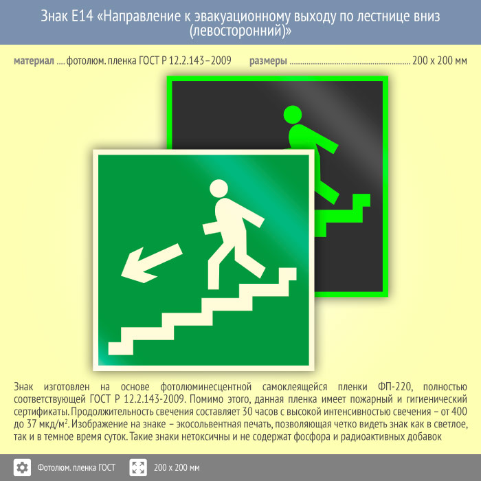 Знак E14 «Направление к эвакуационному выходу по лестнице вниз (левосторонний)» (фотолюминесцентная пленка ГОСТ 34428-2018, 200х200 мм) в Ульяновске купить