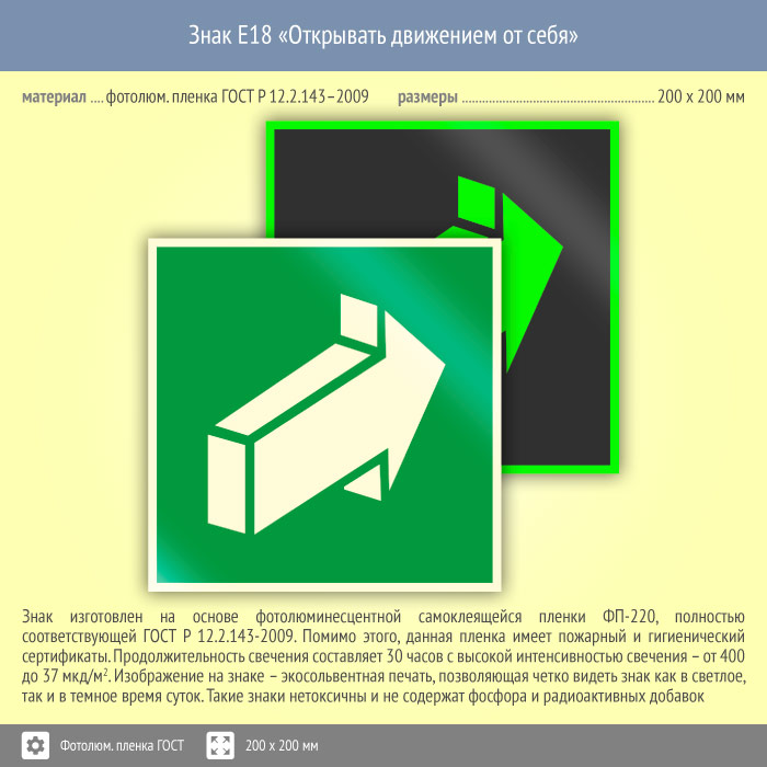 Знак E18 «Открывать движением от себя» (фотолюминесцентная пленка ГОСТ 34428-2018, 200х200 мм) в Ульяновске купить