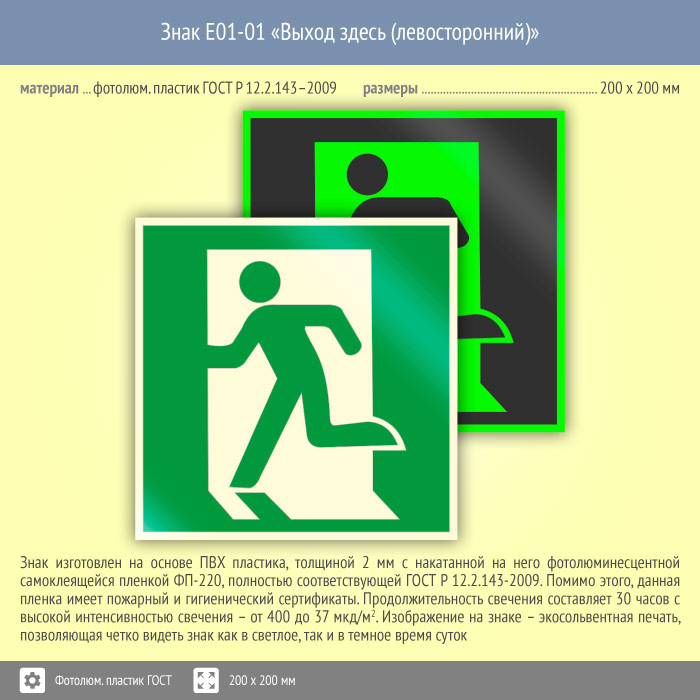 Знак E01-01 «Выход здесь (левосторонний)» (фотолюминесцентный пластик ГОСТ 34428-2018, 200х200 мм) в Ульяновске купить